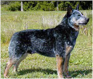 A strong head and slightly curved, broad skull herald the dingo ancestry. Cheeks are muscular, and the muzzle and jaws powerful in appearance. Their medium-sized, pricked ears, suspicious glint and strong teeth give the cattle dog a slightly intimidating demeanour.The Cattle Dog's neck is exceptionally muscular and somewhat stocky. The shoulders are broad and the chest deep. The tail is set low and hangs to the level of the hocks. Their solid frame is 17 to 20 inches at the withers, the males slightly larger than the females.The dual coat consists of an outer protective layer of moderately short, straight, medium-texture hairs, and a short, dense layer below. Cattle dogs come in two different colour schemes: red speckle and blue. "Blue heelers," as the latter variety is sometimes called, are blue or blue mottled, with black, blue or tan markings on the head; while the undercoat is often tan. The red variety has an even, red speckle, (from their Dalmatian genes), with or without darker red markings on the head.|