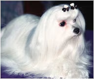 The body is compact, the shoulder blades sloping. The back is level and the ribs well sprung. The tufted tail is carried gracefully over the back. The neck is elegantly structured to promote high carriage of the head.The head is well proportioned to the body and the skull is slightly rounded. The drop ears are low set and heavily feathered. The eyes are dark, the nose black and the muzzle of medium length and slightly tapered.The long, silky coat that sweeps or hangs close to the ground gives the Maltese an almost ornamental appearance. The long hair on the head may be tied in a topknot or left hanging. The coat colour is pure white. The Maltese moves in a buoyant, flowing gait.|
