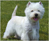 They are stocky little dogs but quite fast and agile.West Highland white terriers are immediately identifiable by their dense, harsh white coats. These are fairly short coats but tough enough to push through brambles and harsh enough to shed dirt easily. The coat needs to be clipped or hand stripped to work out the dead undercoat. The white colour helped their guardians to see them in the fields and distinguish them from the prey they were hunting. Despite the white coat colour, these dogs are not albinos. They should have dark pigment around the eyes, mouth and nose.The ears are upright and the tail moderate in length and sturdy. |